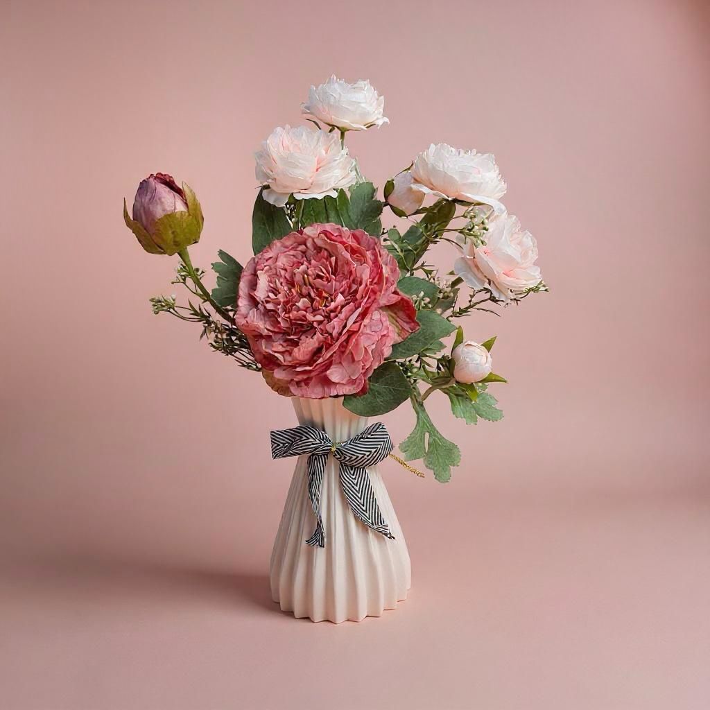 No centro, uma única peônia rosa floresce em plenitude — símbolo de afeto raro e beleza única. Ao seu redor, ranúnculos brancos dançam em harmonia assimétrica, como um coro suave que celebra quem recebe: alguém verdadeiramente especial.