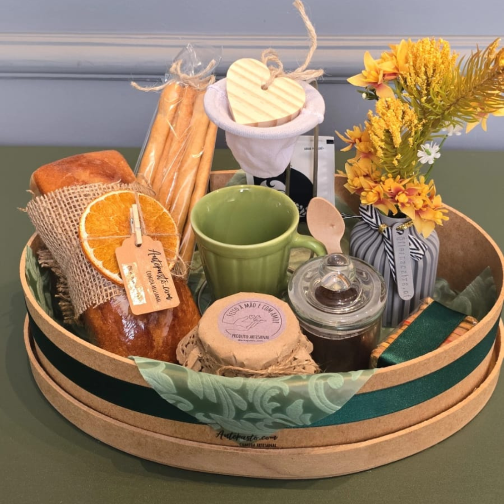 Nesta bandeja, cada detalhe foi escolhido para transformar a rotina em ritual: o aroma do bolo de laranja, o encanto do mini coador de café e a delicadeza da xícara que convida à pausa.